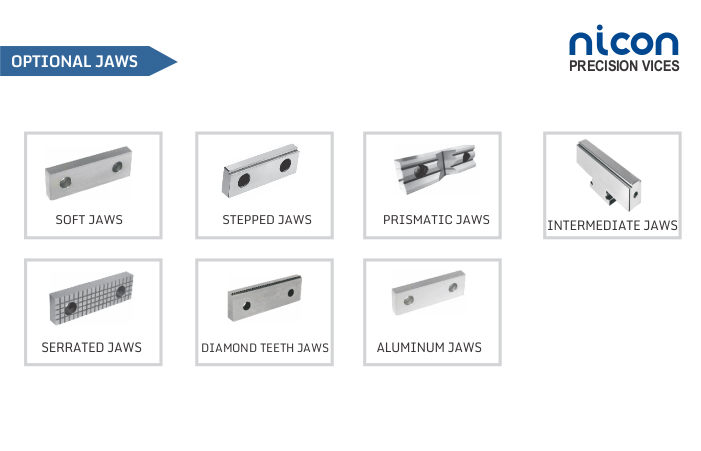 - Four extra tapped hole in moving and fixed rear blocks in front and top for optional jaws and fixtures.